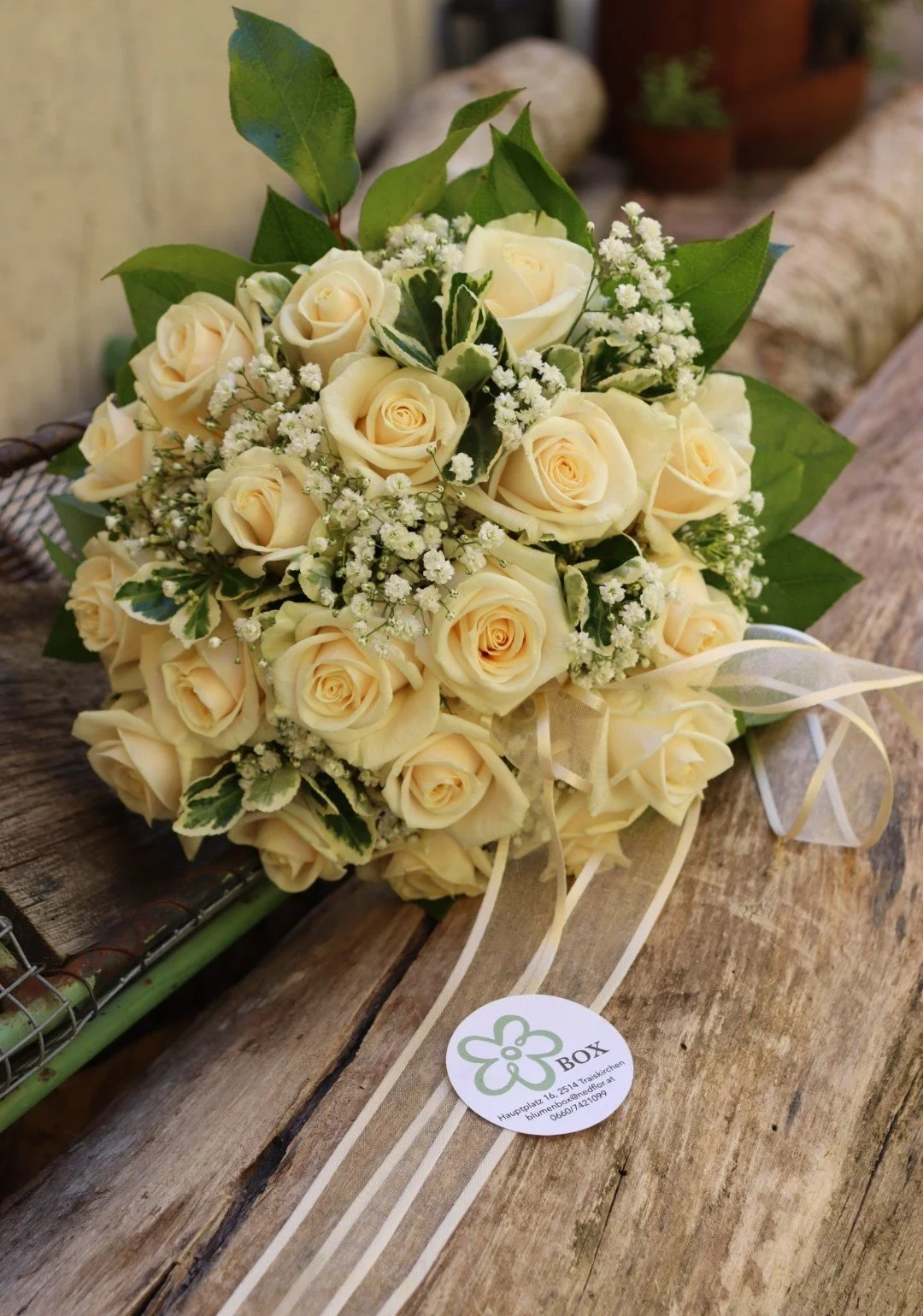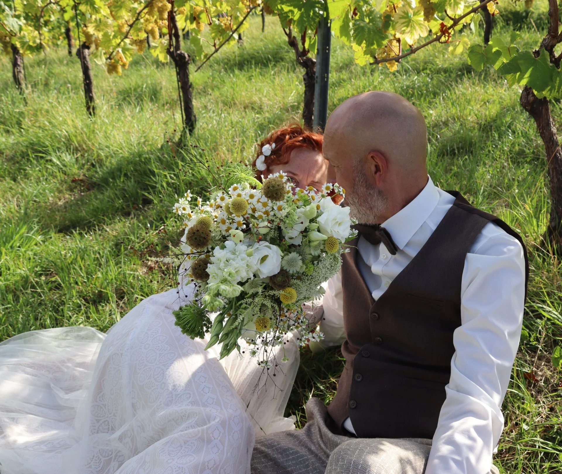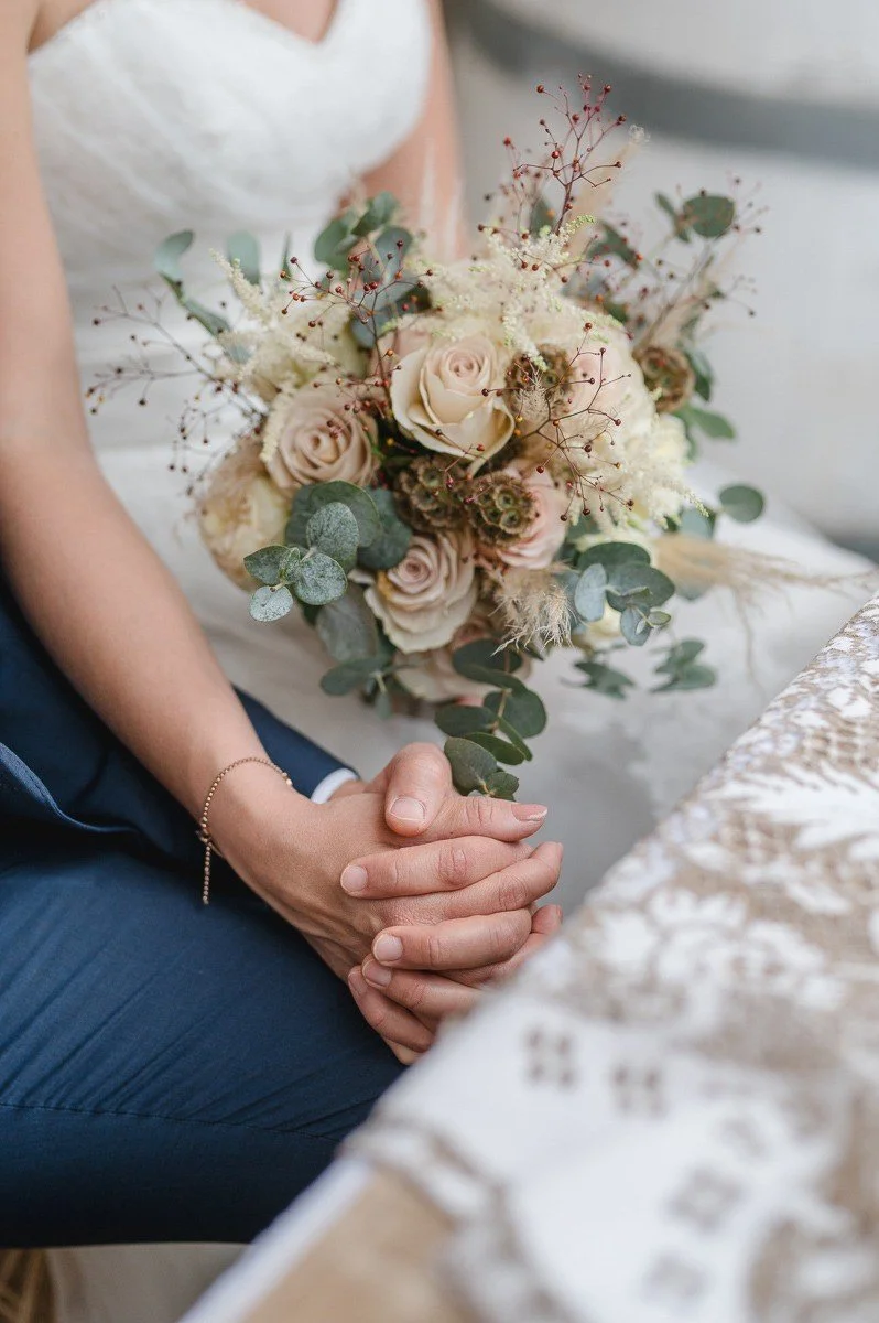 Nahaufnahme eines Brautpaares, das zerstückelt sitzt, die Hände sind aufeinandergelegt. Die Braut hält einen Hochzeitsstrauß aus weißen Rosen, Eukalyptus und weiteren Blüten.