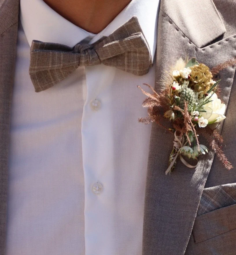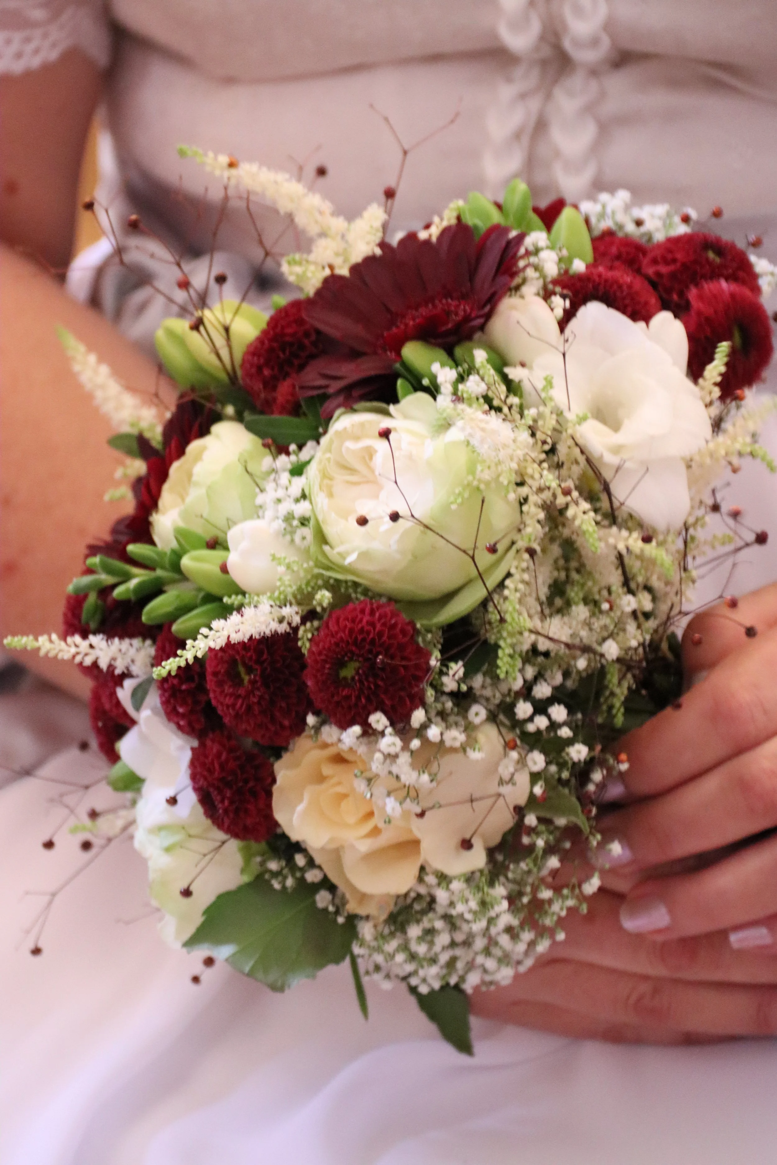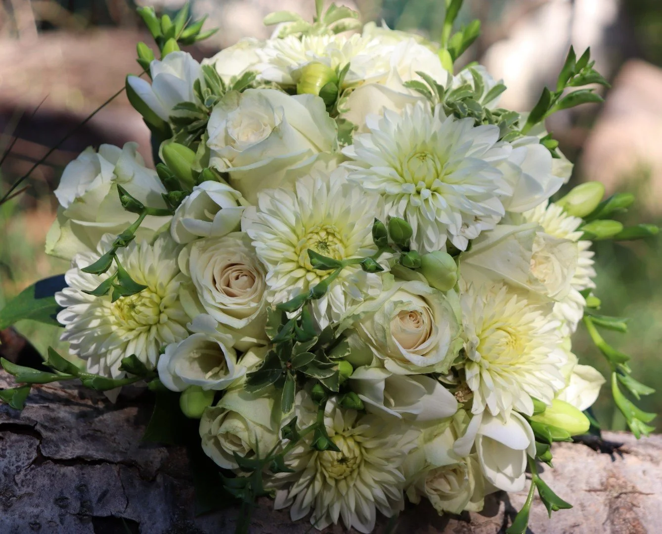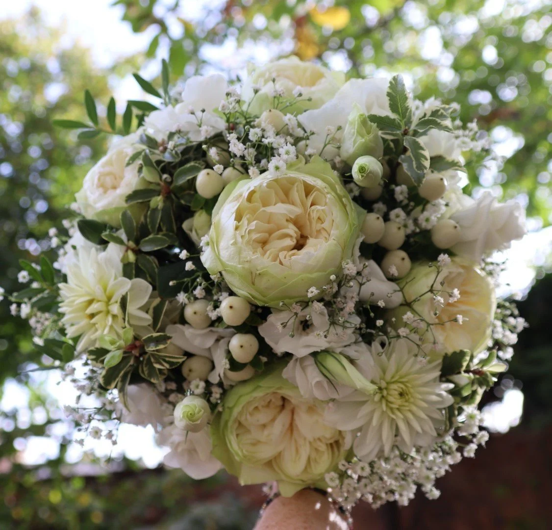 Nahaufnahme eines Brautpaares, das zerstückelt sitzt, die Hände sind aufeinandergelegt. Die Braut hält einen Hochzeitsstrauß aus weißen Rosen, Eukalyptus und weiteren Blüten.