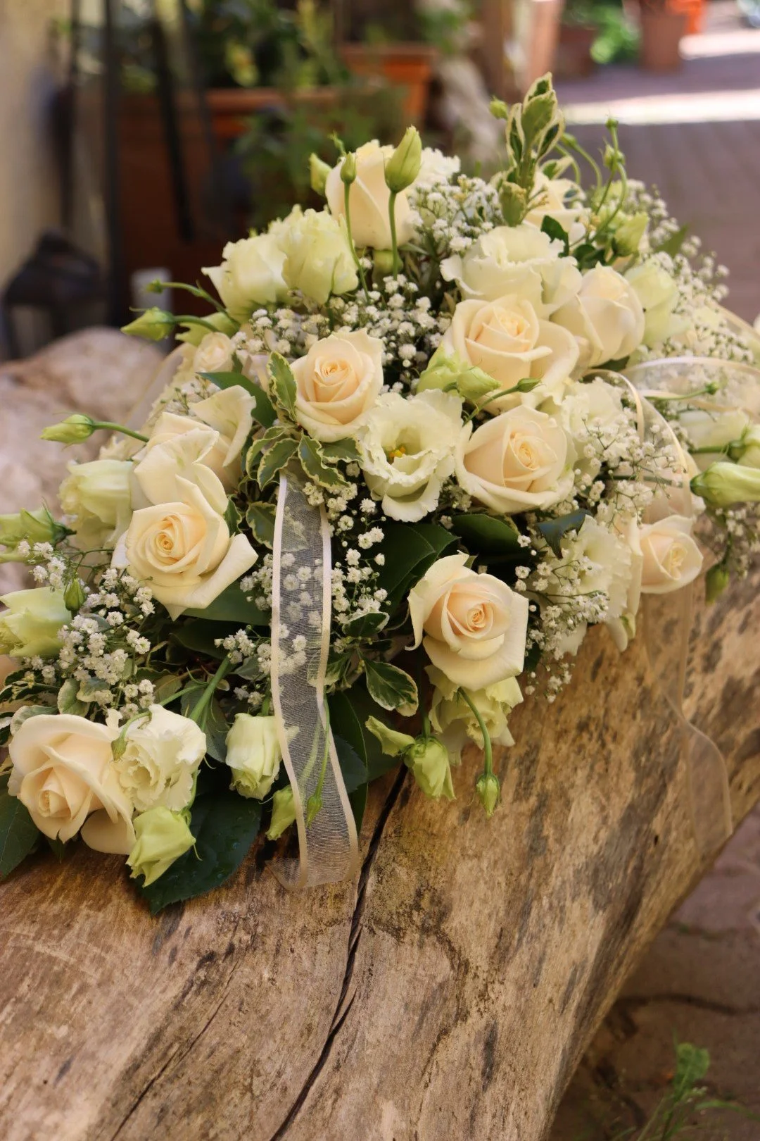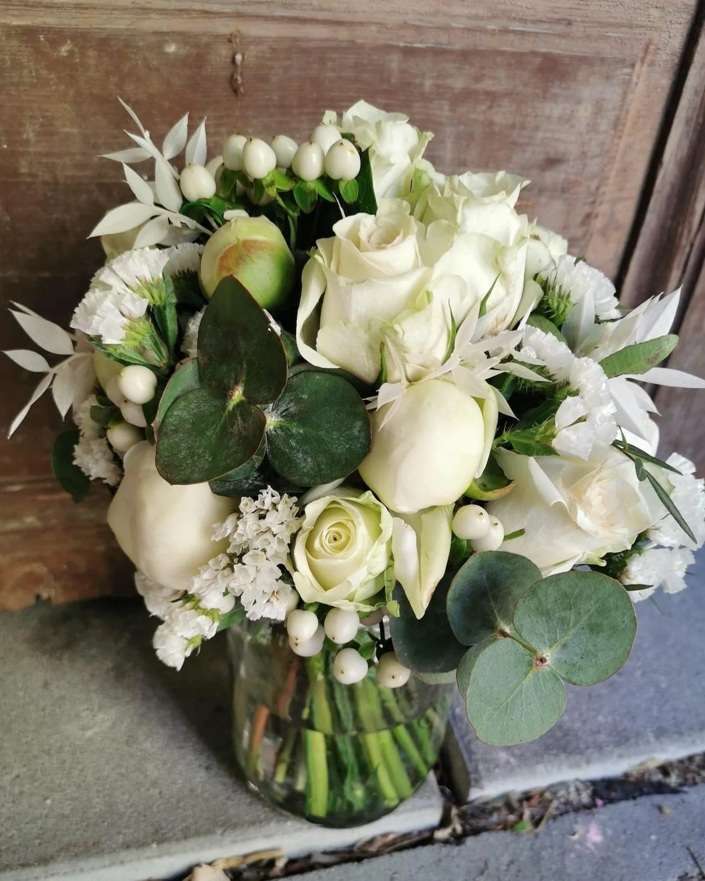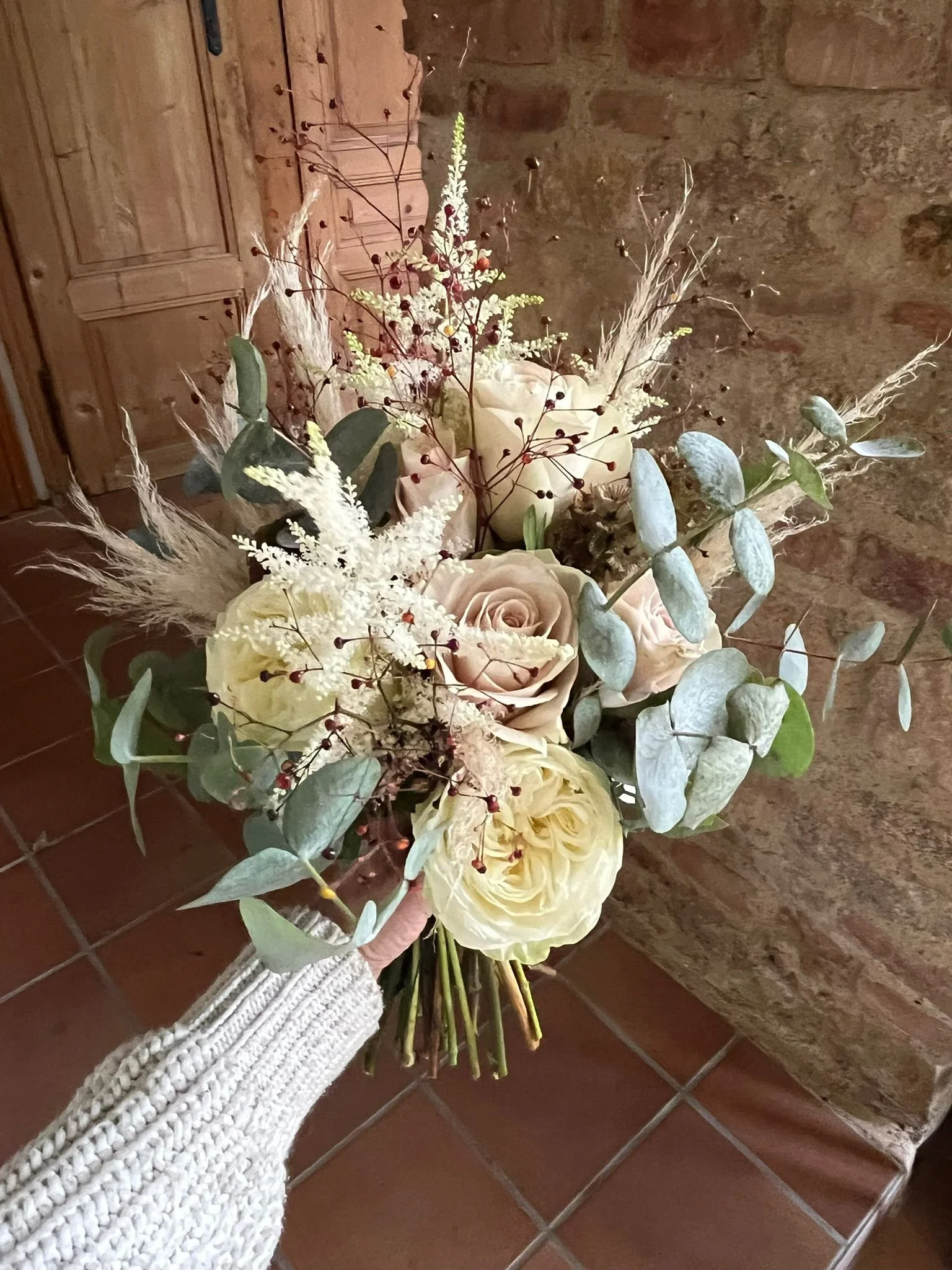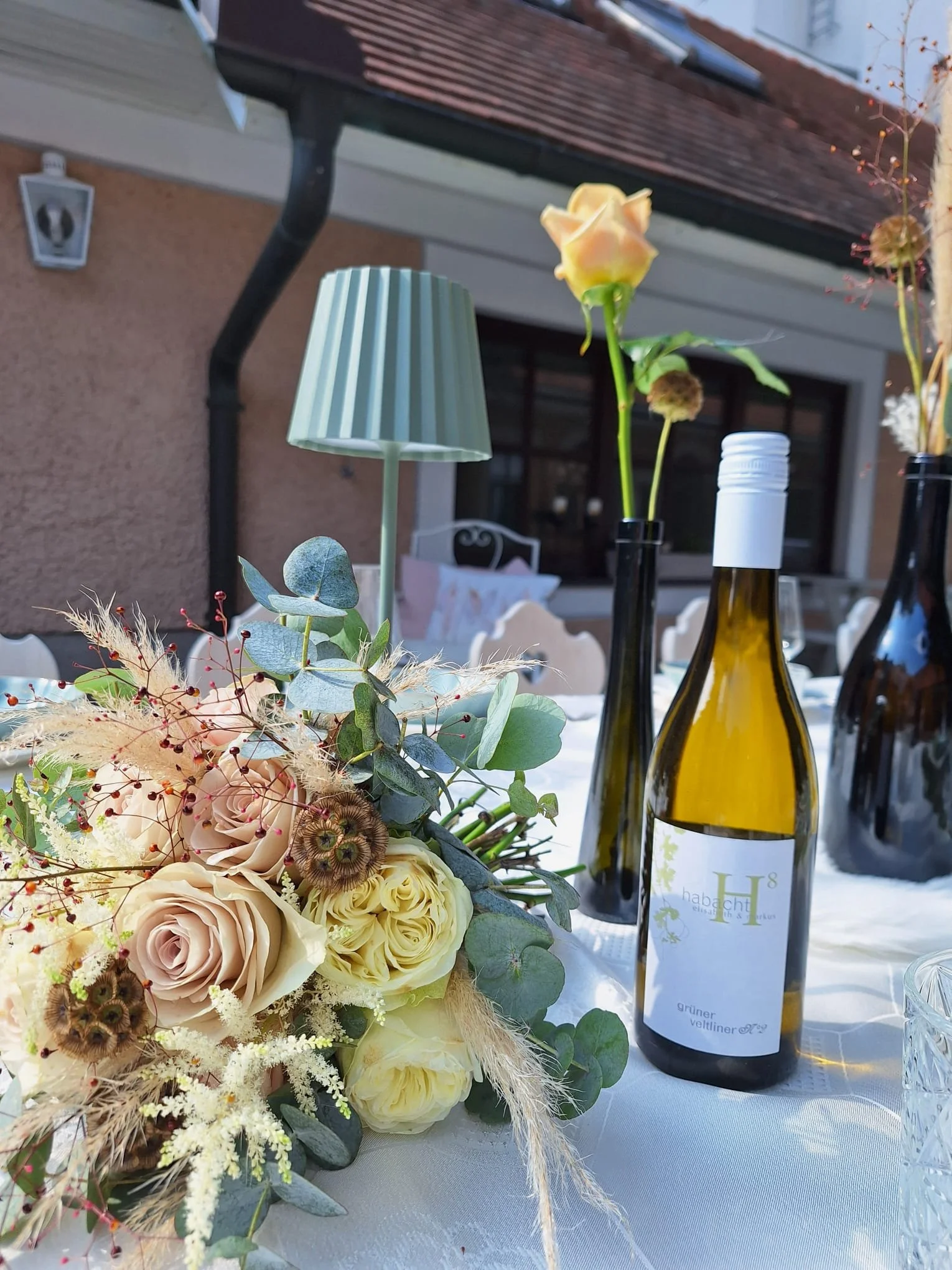 Blumenstrauß aus Rosen, Eukalyptus und anderen Pflanzen, Weinflasche mit weißen Korken und einem kleinen grünen Lampenschirm auf einem Tisch bei einer Feier im Freien.