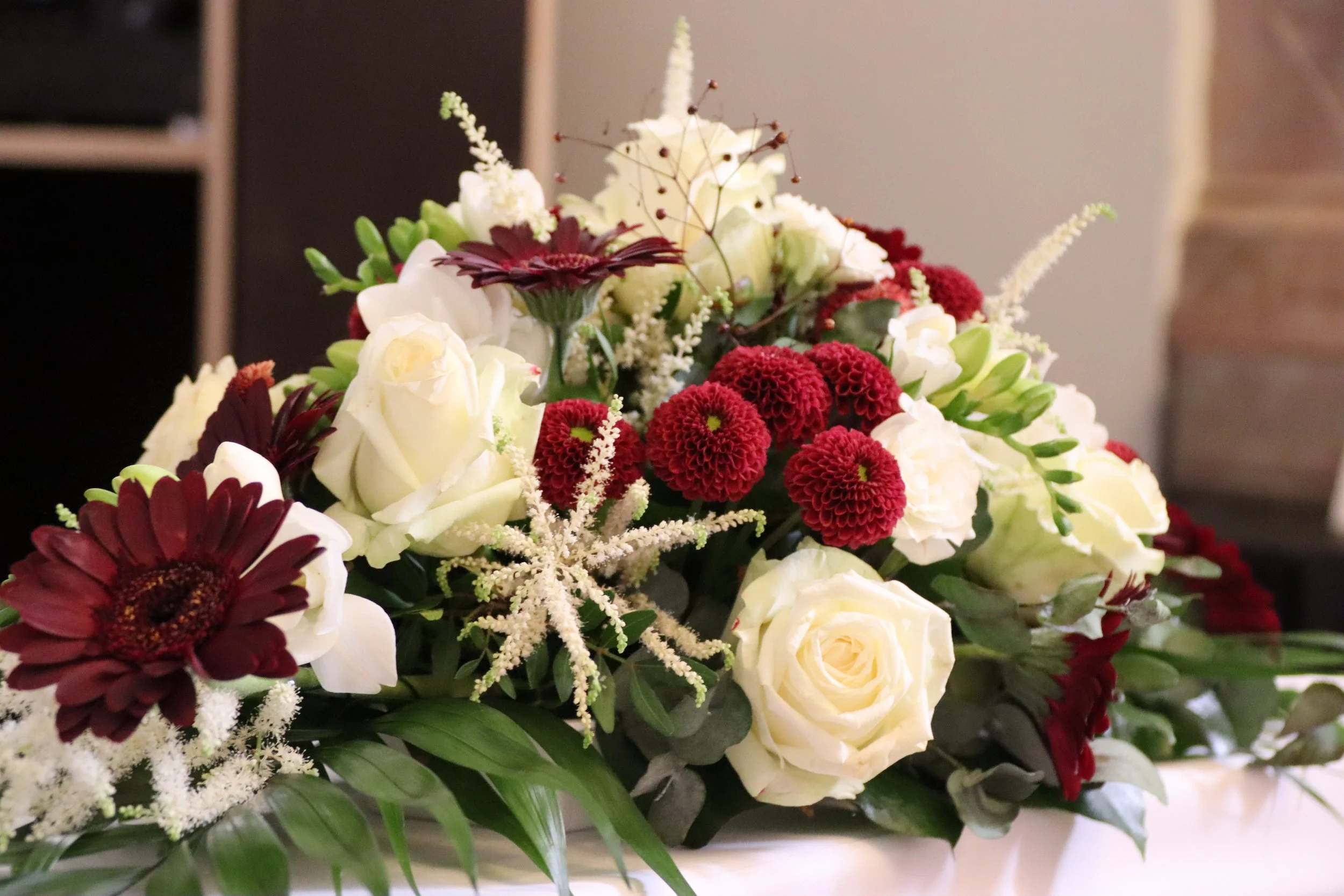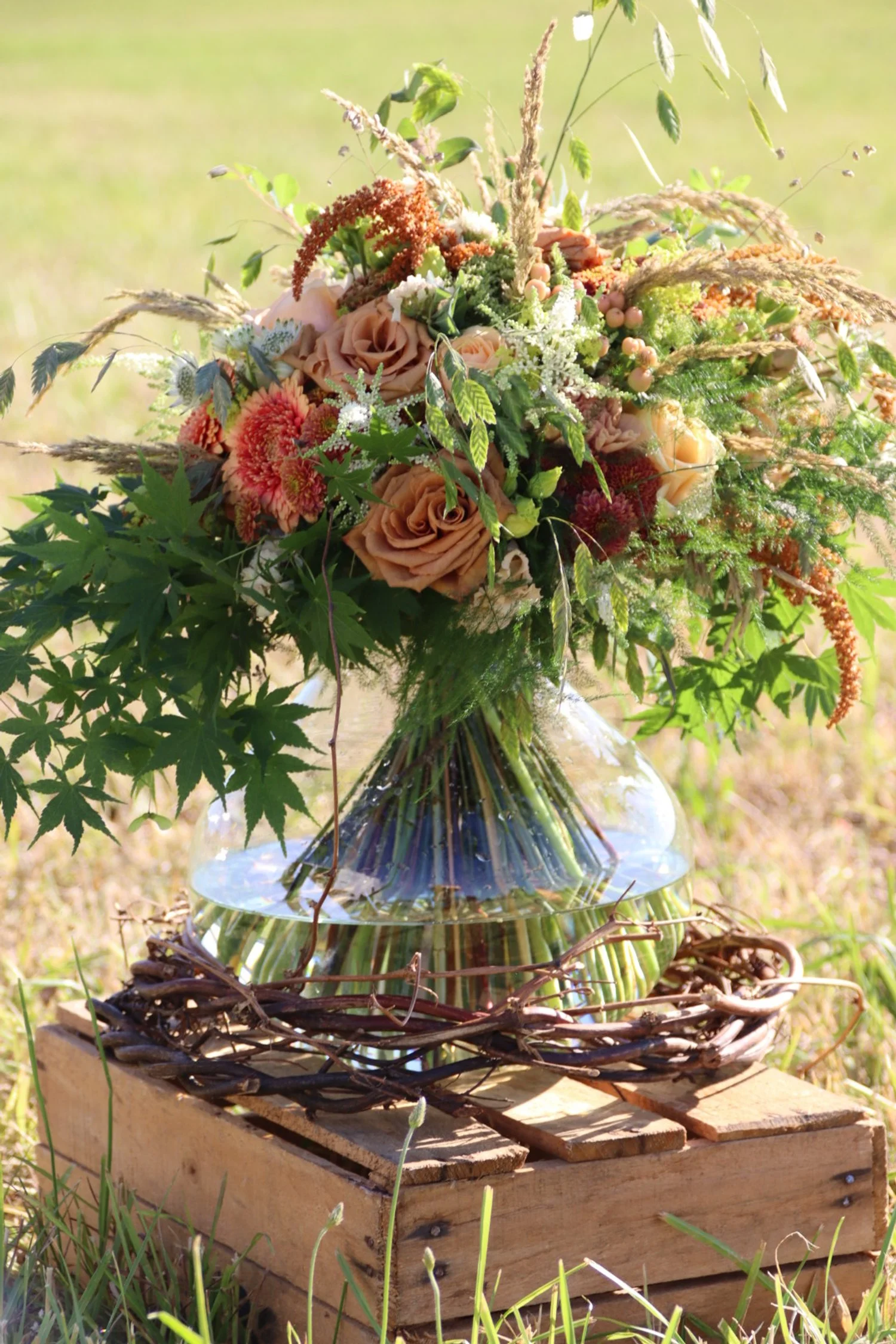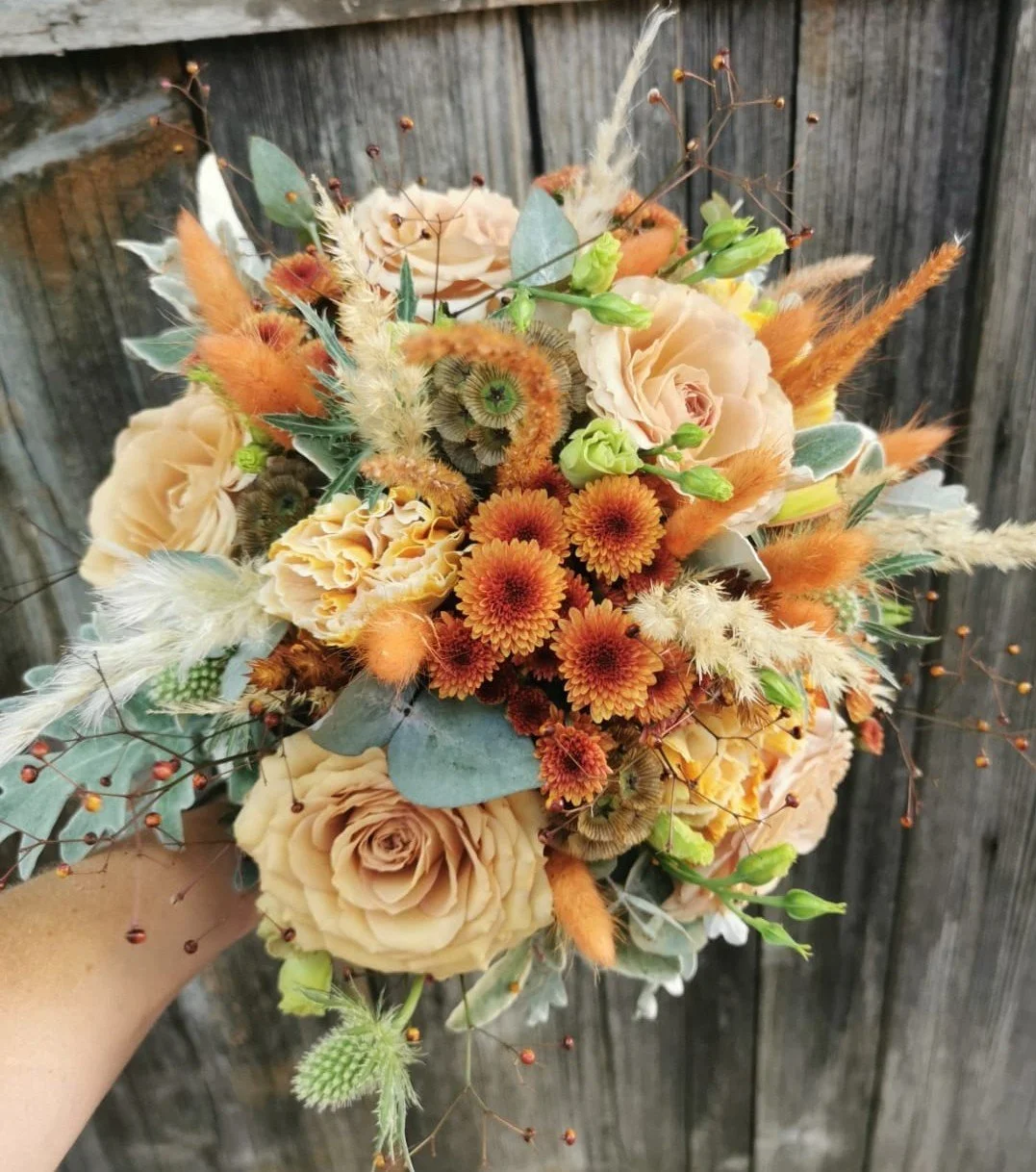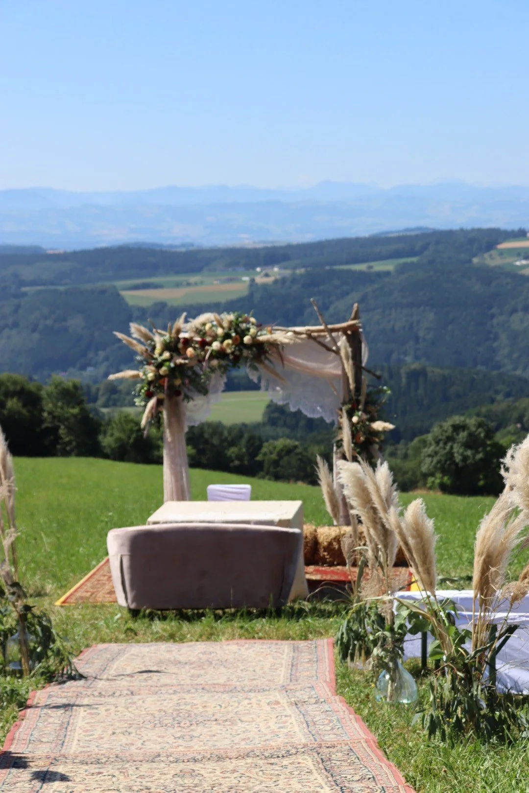 Blumenstrauß aus Rosen, Eukalyptus und anderen Pflanzen, Weinflasche mit weißen Korken und einem kleinen grünen Lampenschirm auf einem Tisch bei einer Feier im Freien.
