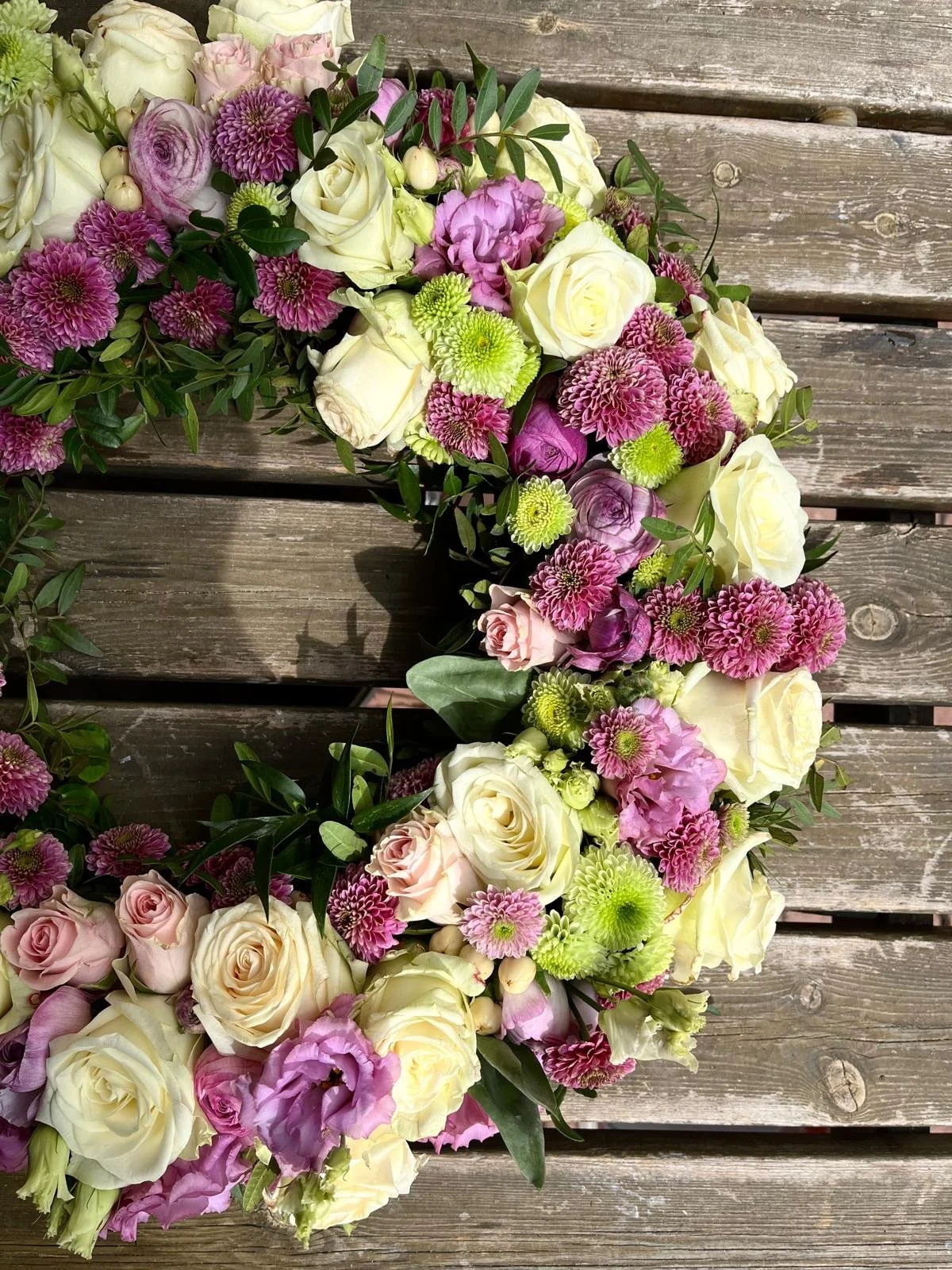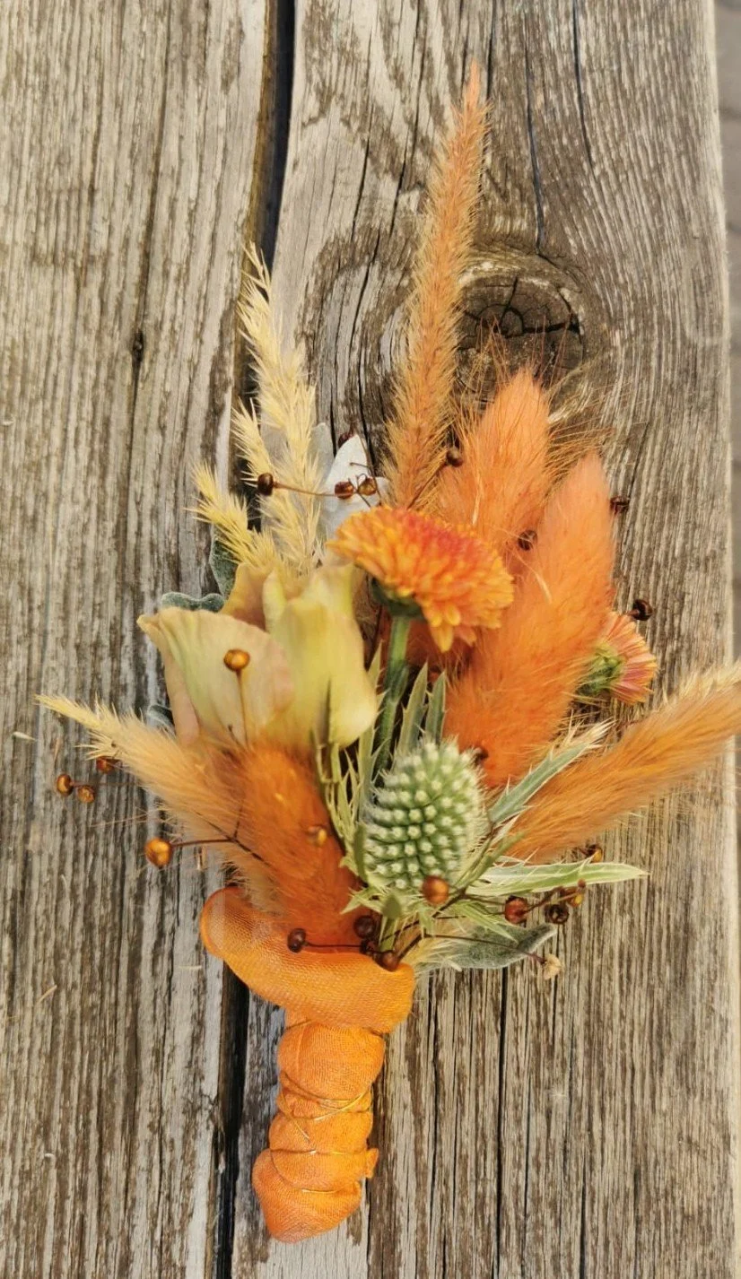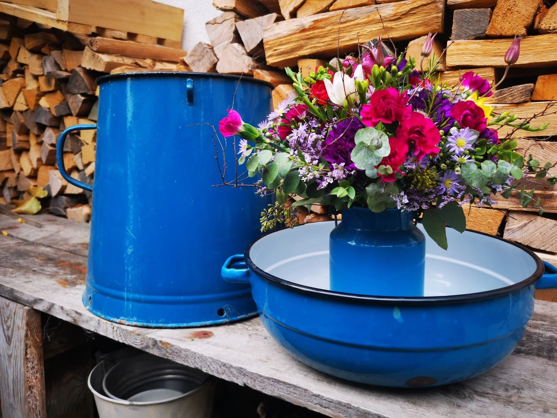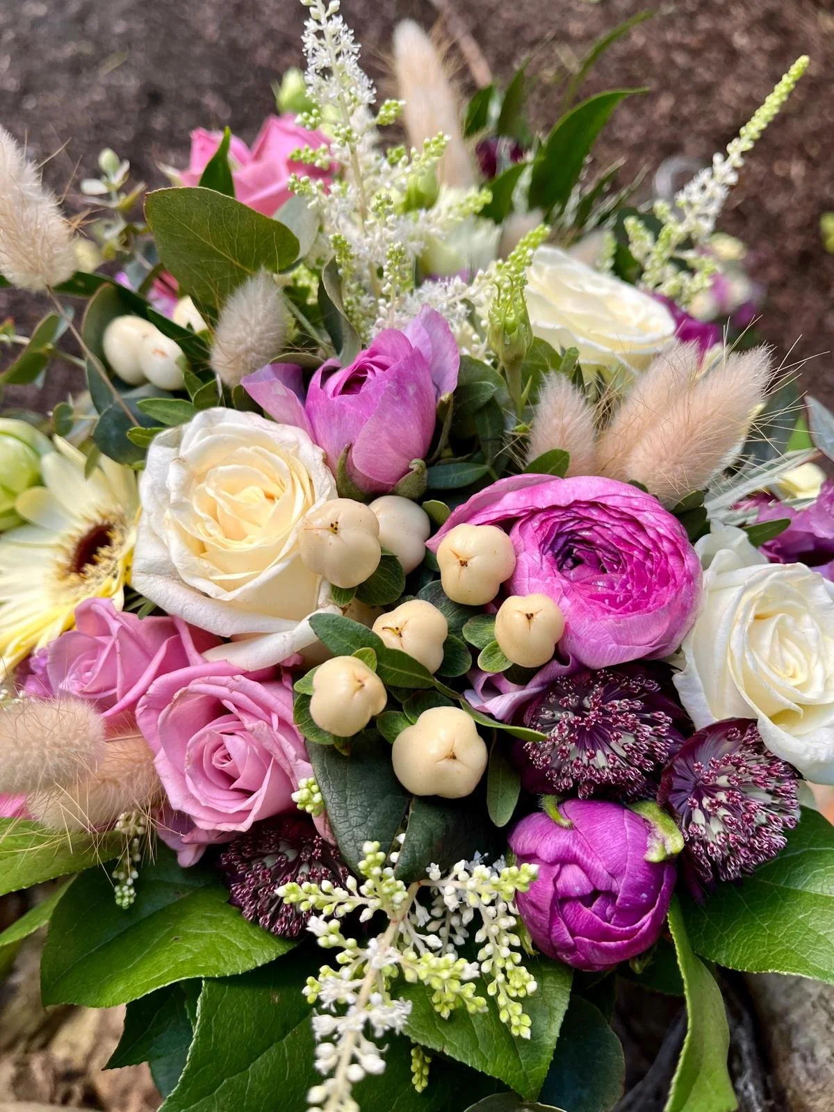 Blumenstrauß aus Rosen, Eukalyptus und anderen Pflanzen, Weinflasche mit weißen Korken und einem kleinen grünen Lampenschirm auf einem Tisch bei einer Feier im Freien.