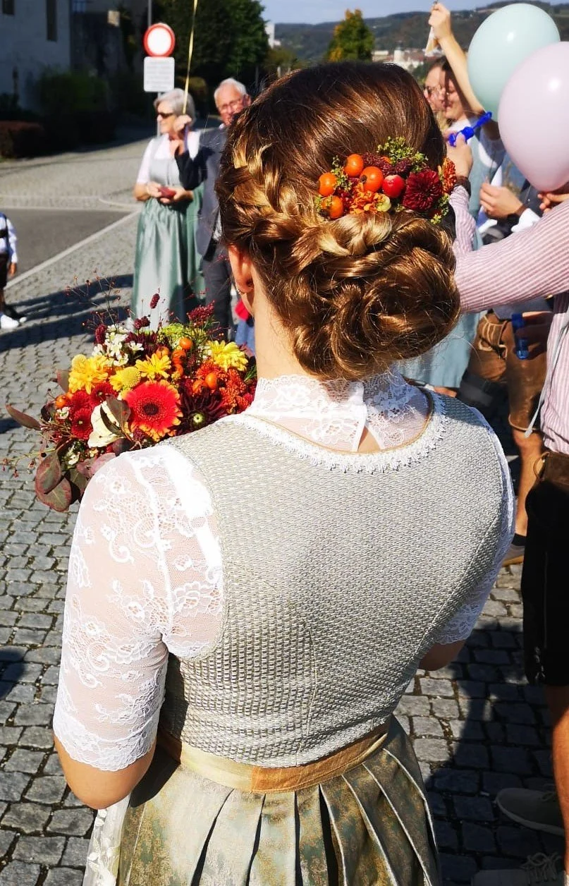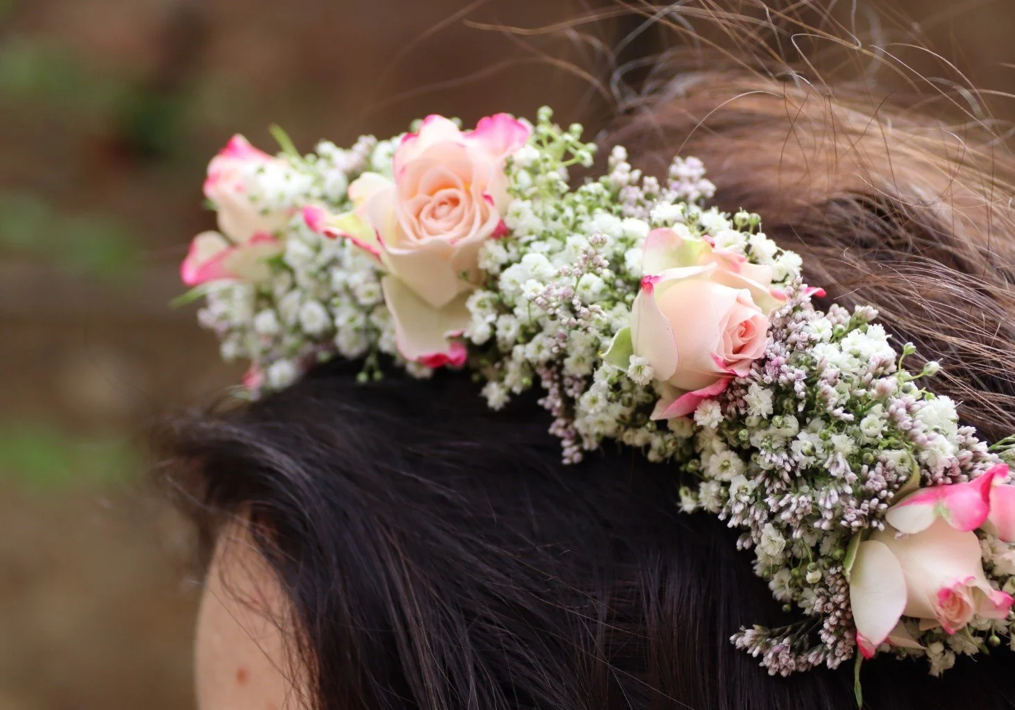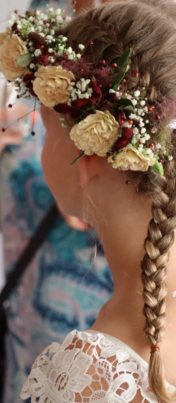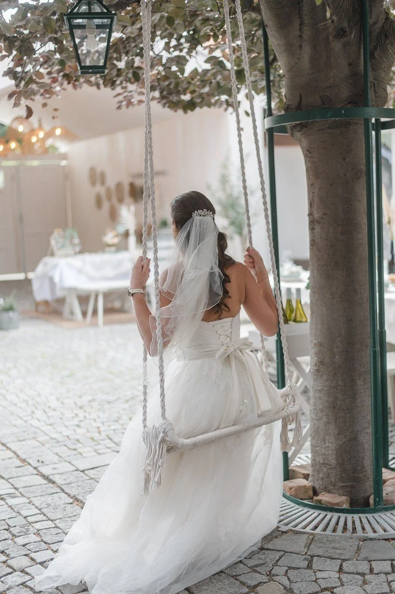 Braut in Hochzeitskleid auf einer Schaukel, unter einem Baum im Freien, mit Dekoration im Hintergrund.