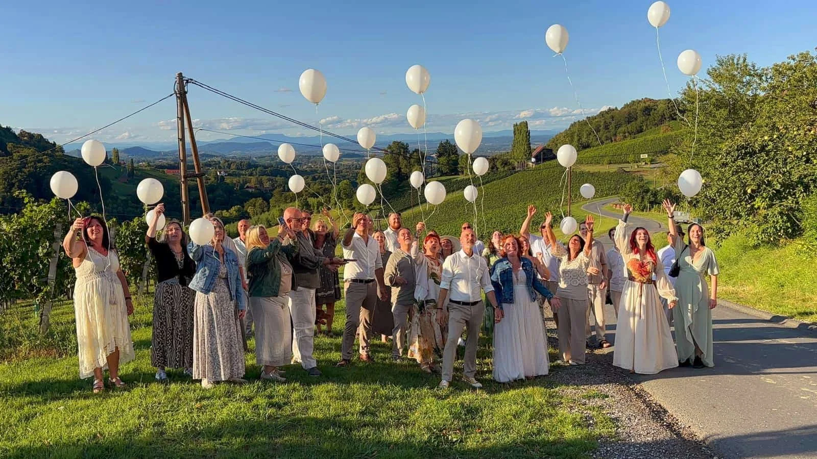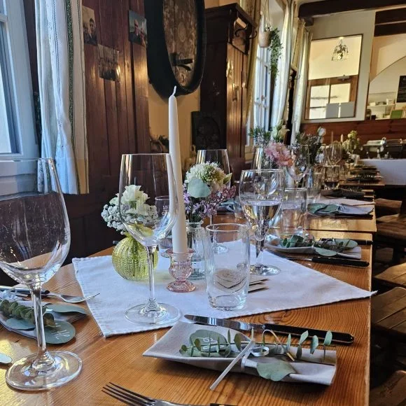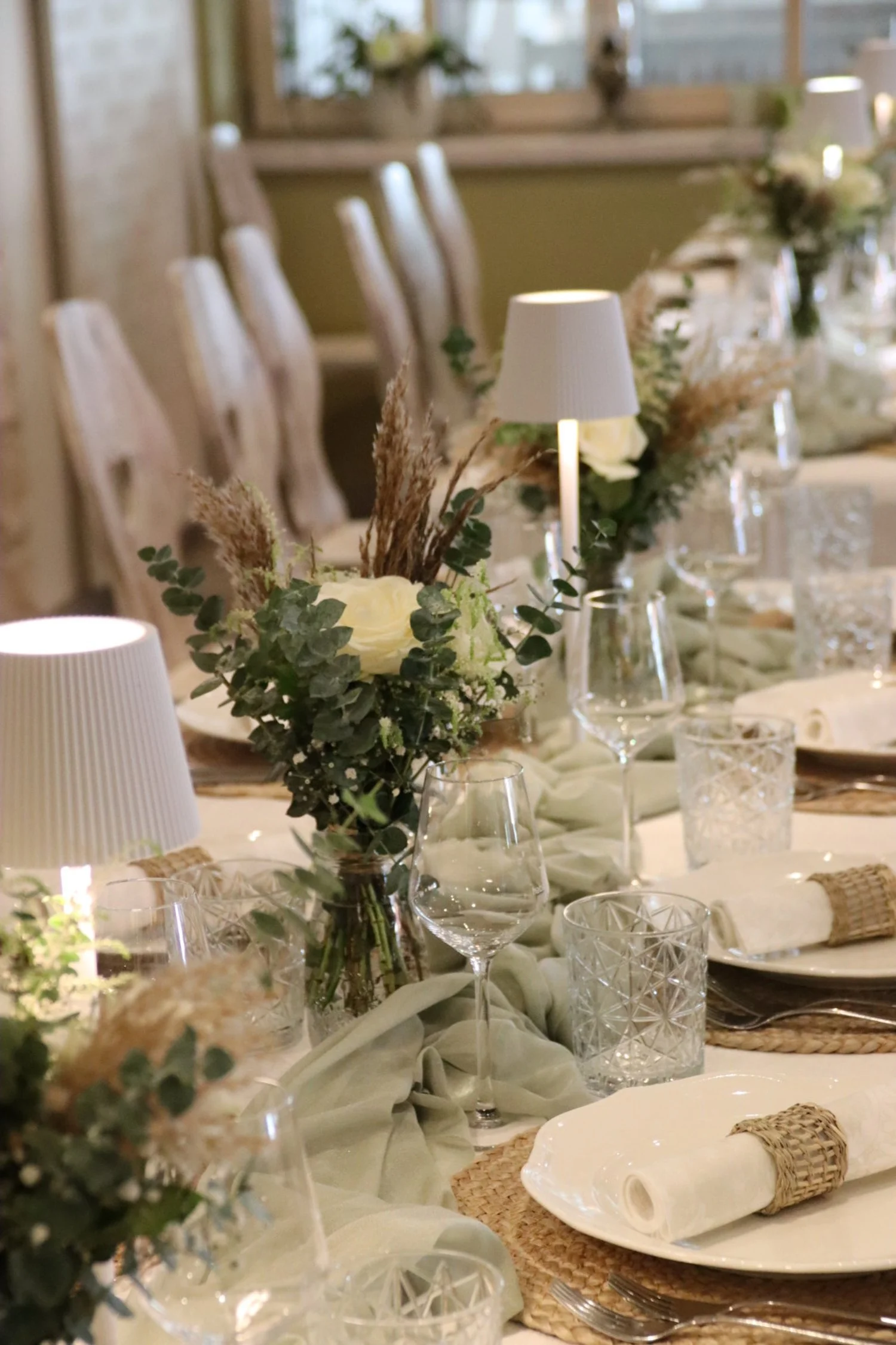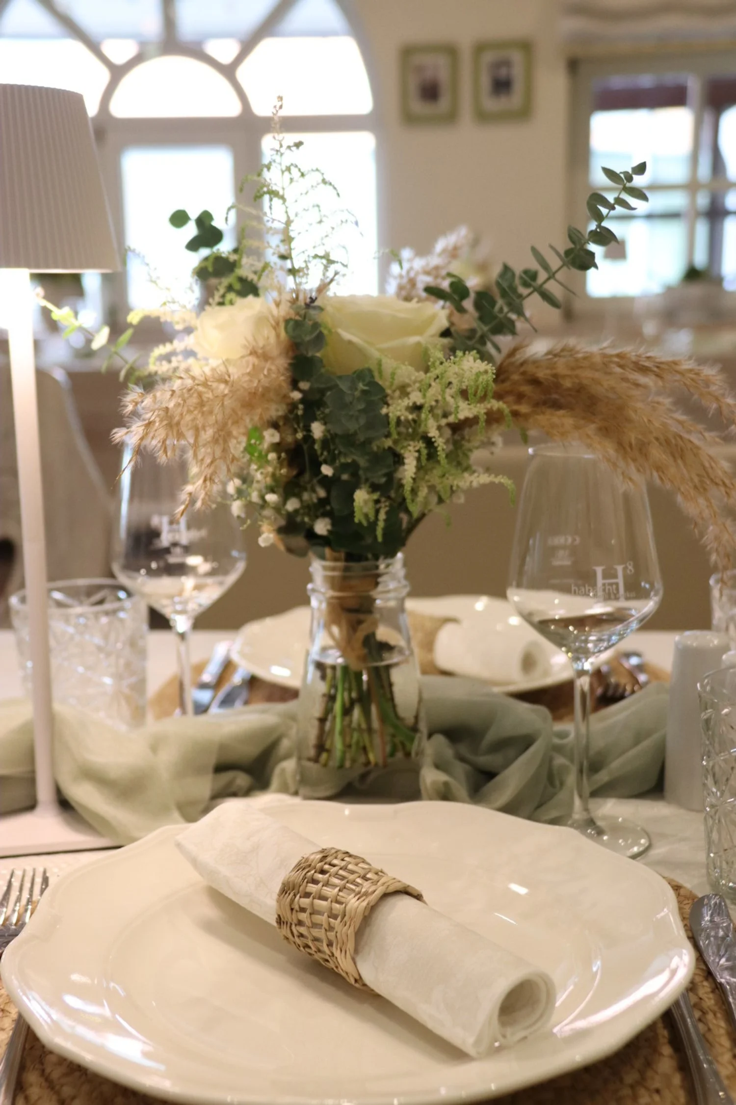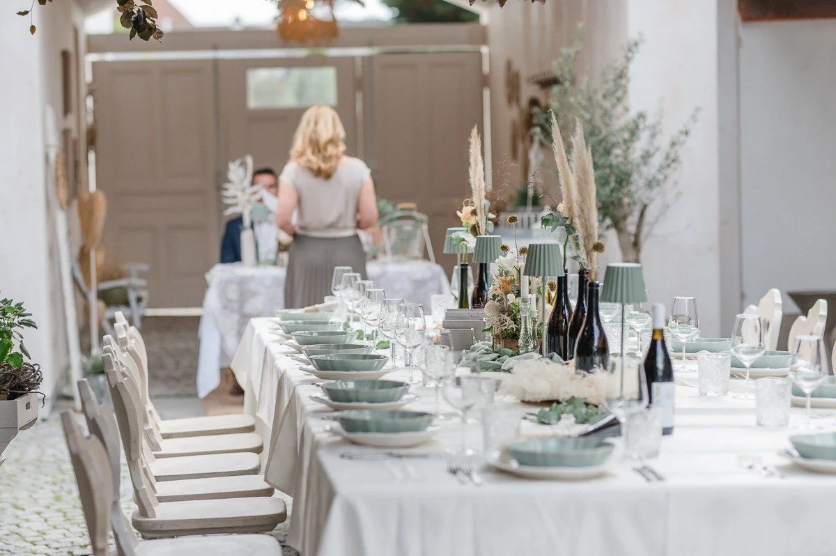 Ein festlich gedeckter Esstisch im Außenbereich mit weißen Tischen, grünen Tellern, Gläsern, Silberbesteck, Blumenarrangements, Flaschen Wein, und kleinen Lampen, im Hintergrund eine Villa.