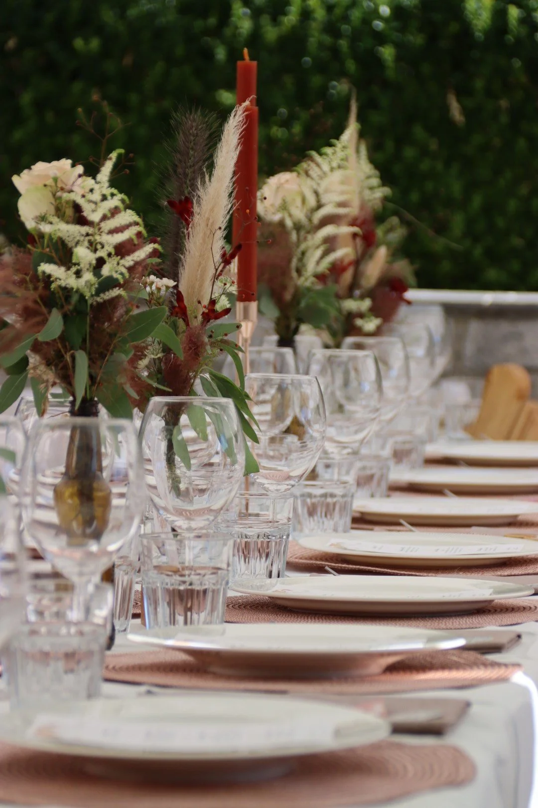 Ein festlich gedeckter Esstisch im Innenhof mit weißen Tischtüchern, weißen Stühlen, Geschirr, Gläsern, Flaschen und Blumen in Vasen, vorbereitet für eine Feier oder Veranstaltung.